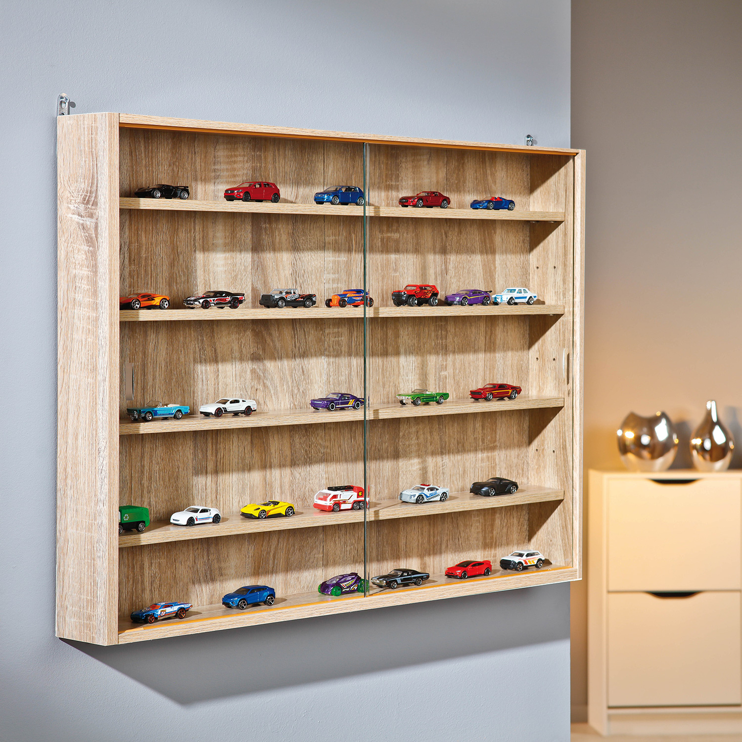 Vitrína COLLECTIZIONI v provedení dub sonoma vystaví všechny vaše cennosti na jednom místě. Ať už vitrínu umístíte do chodby, kuchyně, pracovny, dětského pokoje či obývacího pokoje, vždy budete mít originální prostor k uložení vašich pokladů. Do vitríny lze umístit sbírku autíček, rodinné fotografie, suvenýry z cest i sbírku porcelánu. Vitrína přitáhne pozornost a čtyři variabilní poličky umístíte dle svých požadavků. Dvě posuvná bezpečnostní skla uchrání vaše poklady před prachem. Zboží je dodáváno v demontu.