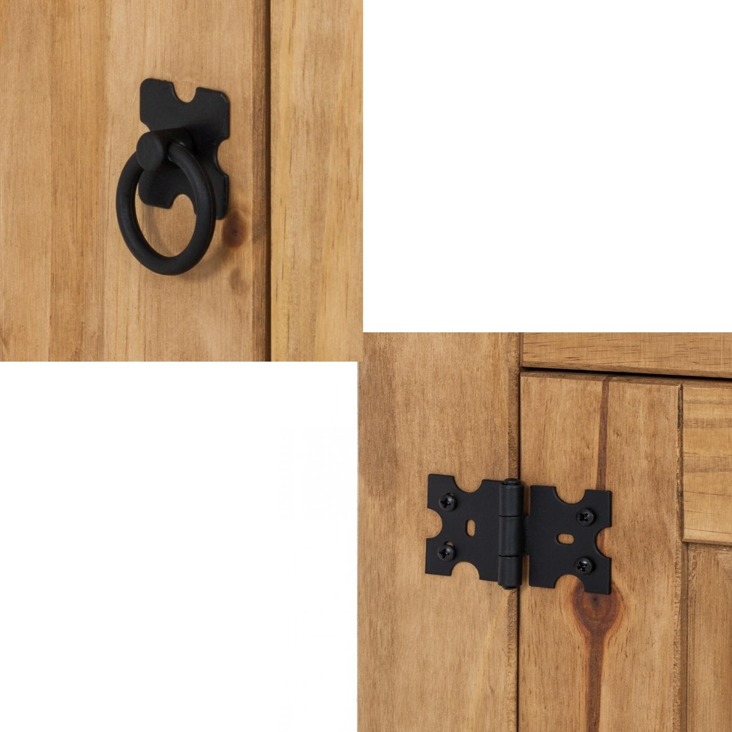 Vitrína v provedení masiv borovice je voskovaná v medovém odstínu, takže bude vypadat kouzelně jak v obývacím pokoji, tak kanceláři či pracovně. Tvar vitríny, kovové zdobení a ozdobné úchyty dávají tomuto kousku nábytku nezaměnitelný vzhled. Částečně prosklená dvířka skryjí dokumenty, ale třeba i knihy a méně používané věci. Vitrína je součástí sestavy Corona. Zboží je dodáváno v demontu.