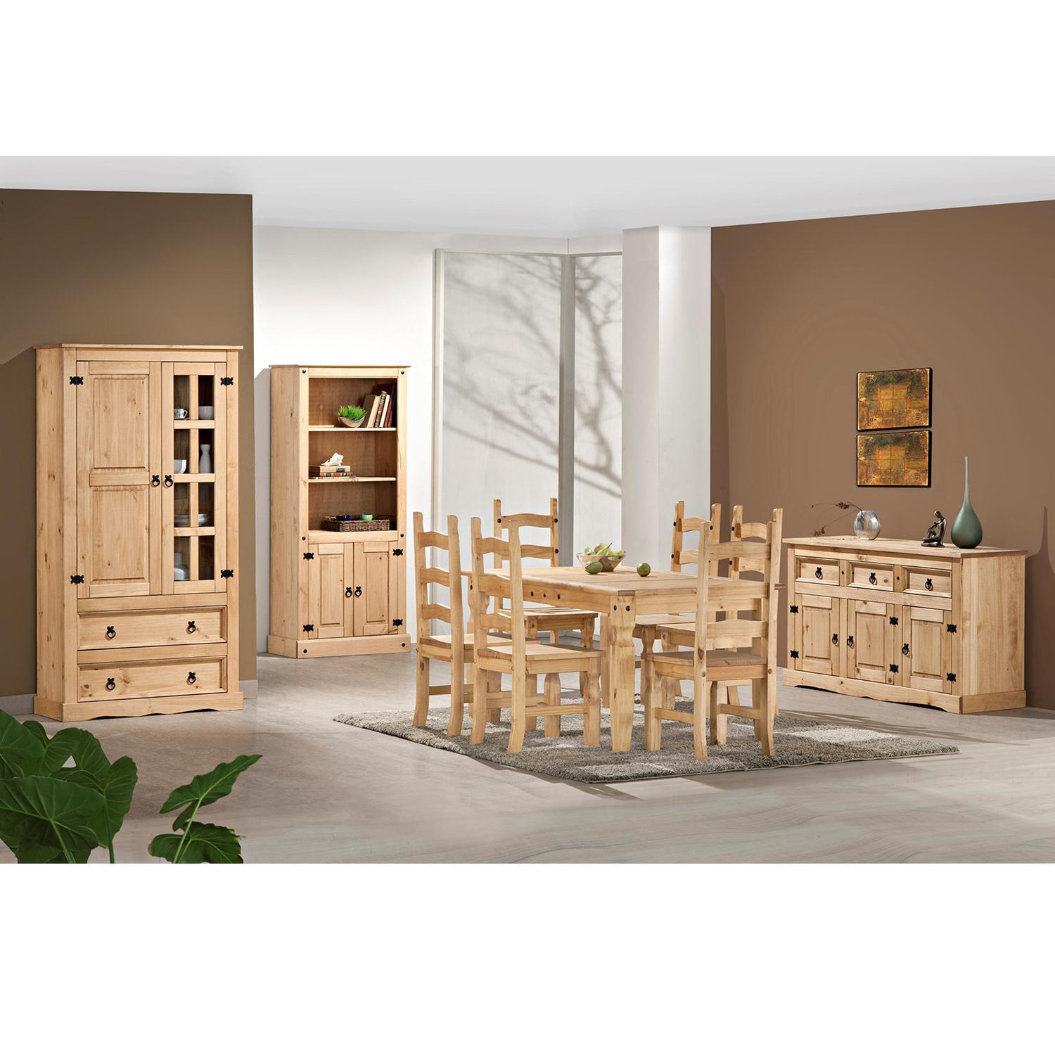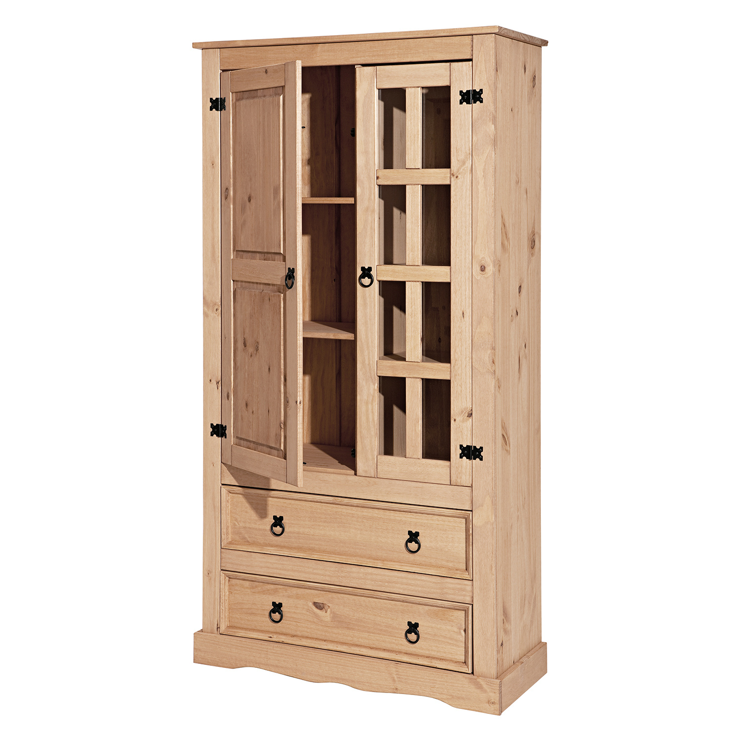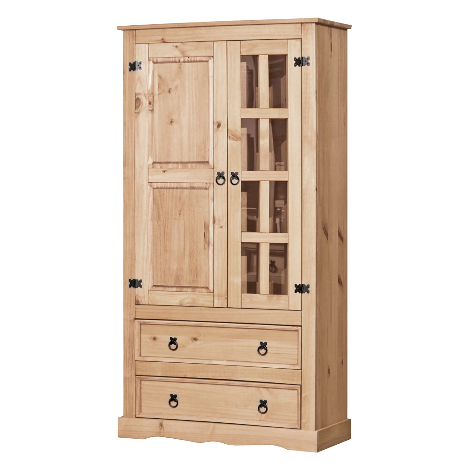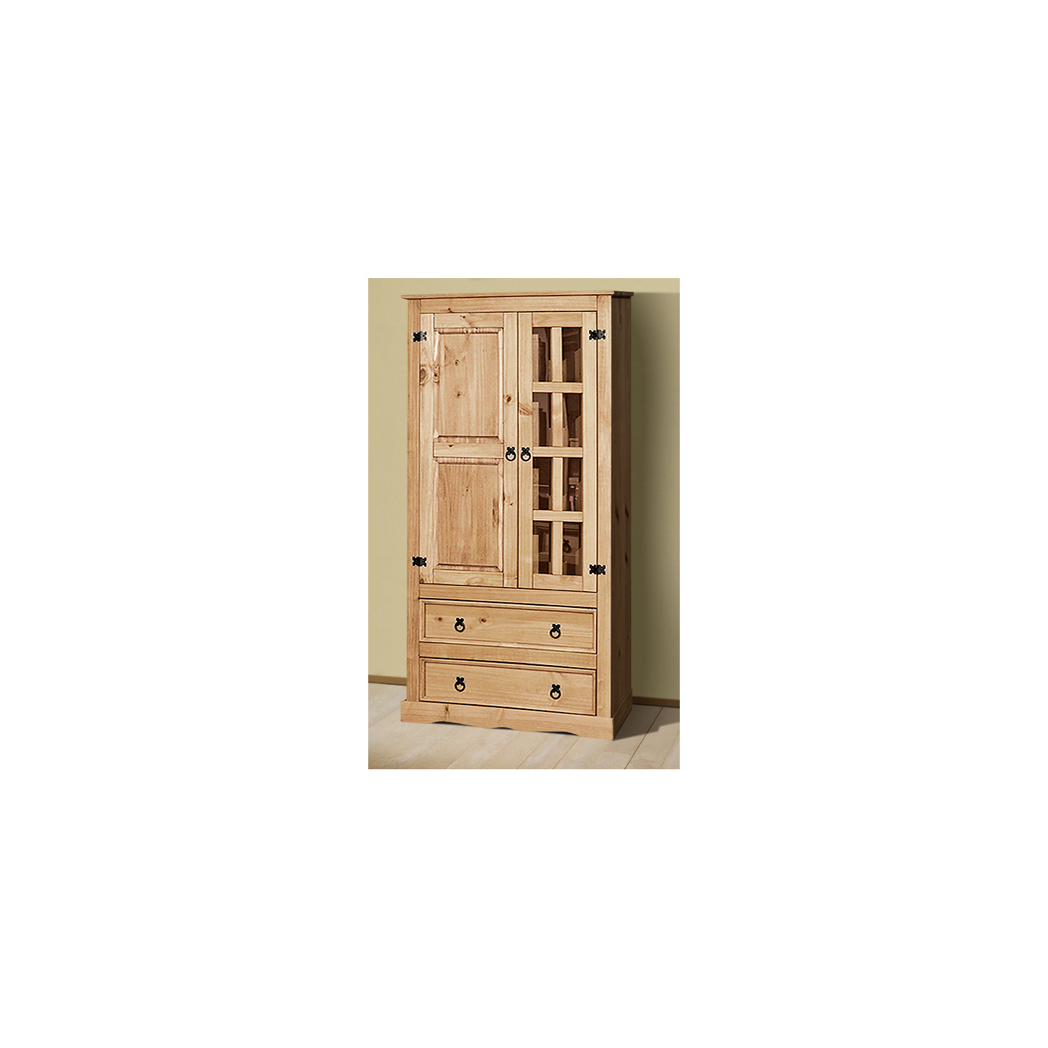 Vitrína CORONA 16254 v provedení masiv borovice bude ozdobou vašeho obývacího pokoje. Tato úžasná vitrína je z velké části uzavřena, má pouze úzkou prosklenou část. Masivní vitrína voskovaná v medovém odstínu skrývá za širšími plnými dvířky tři police. Ve spodní části vitríny se nachází dvě velké zásuvky hluboké 32 cm. Vitrína vypadá jedinečně i díky kovovým ozdobným pantům a úchytkám. Je součástí sestavy Corona. Zboží je dodáváno v demontu.
