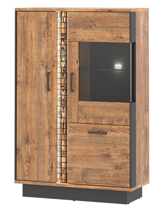 Moderní vitrína v provedení dub april/černý. Korpus má vyrobený z lamina o síle 16 mm a MDF o síle 16 mm, ohraněný ABS 0,5 mm / 1,5 mm. Dvířka jsou vyrobeny z MDF o síle 18 mm a jsou potaženy PVC folií.  Vrchní desky korpusu jsou vyrobeny z lamina o síle 22 mm. Vnitřní poličky jsou vyrobeny z lamina o síle 16 mm a ABS 0,5 mm. Nohy a úchytky jsou kovové. Zásuvky s kuličkovými pojezdy( GTV) jsou plným výsuvem. Systém tichého dovírání dvířek ve standardu, panty 35 mm jsou nastavitelné ve třech osách. Ozdobné rylování je osvětleno LED osvětlením. Zboží je dodáváno v demontu.