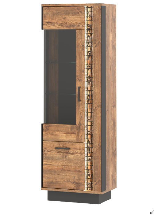 Moderní prosklená vitrína v provedení dub april/černý. Korpus má vyrobený z lamina o síle 16 mm a MDF o síle 16 mm, ohraněný ABS 0,5 mm / 1,5 mm. Dvířka jsou vyrobeny z MDF o síle 18 mm a jsou potaženy PVC folií. Vrchní desky korpusu jsou vyrobeny z lamina o síle 22 mm. Vnitřní poličky jsou vyrobeny z lamina o síle 16 mm a ABS 0,5 mm. Nohy a úchytky jsou kovové. Zásuvky s kuličkovými pojezdy( GTV) jsou plným výsuvem. Systém tichého dovírání dvířek ve standardu, panty ⌀ 35 mm jsou nastavitelné ve třech osách. Ozdobné rylování je osvětleno LED osvětlením. Zboží je dodáváno v demontu.