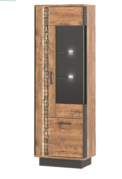 Moderní prosklená vitrína v provedení dub april/černý. Korpus má vyrobený z lamina o síle 16 mm a MDF o síle 16 mm, ohraněný ABS 0,5 mm / 1,5 mm. Dvířka jsou vyrobeny z MDF o síle 18 mm a jsou potaženy PVC folií. Vrchní desky korpusu jsou vyrobeny z lamina o síle 22 mm. Vnitřní poličky jsou vyrobeny z lamina o síle 16 mm a ABS 0,5 mm. Nohy a úchytky jsou kovové. Zásuvky s kuličkovými pojezdy( GTV) jsou plným výsuvem. Systém tichého dovírání dvířek ve standardu, panty ⌀ 35 mm jsou nastavitelné ve třech osách. Ozdobné rylování je osvětleno LED osvětlením. Zboží je dodáváno v demontu.