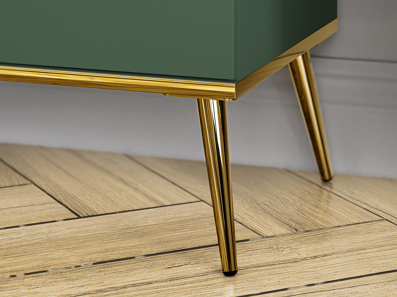 Vitrína Forest je vyrobena z vysoce kvalitní laminované dřevotřískové desky s ABS hranou v barevném provedení zelená v matném provedení. Nábytek stojí na vysokých kovových zlatých nožkách. ÚIchytky jsou kovové ve zlaté barvě. Zboží dodáváme v demontu.