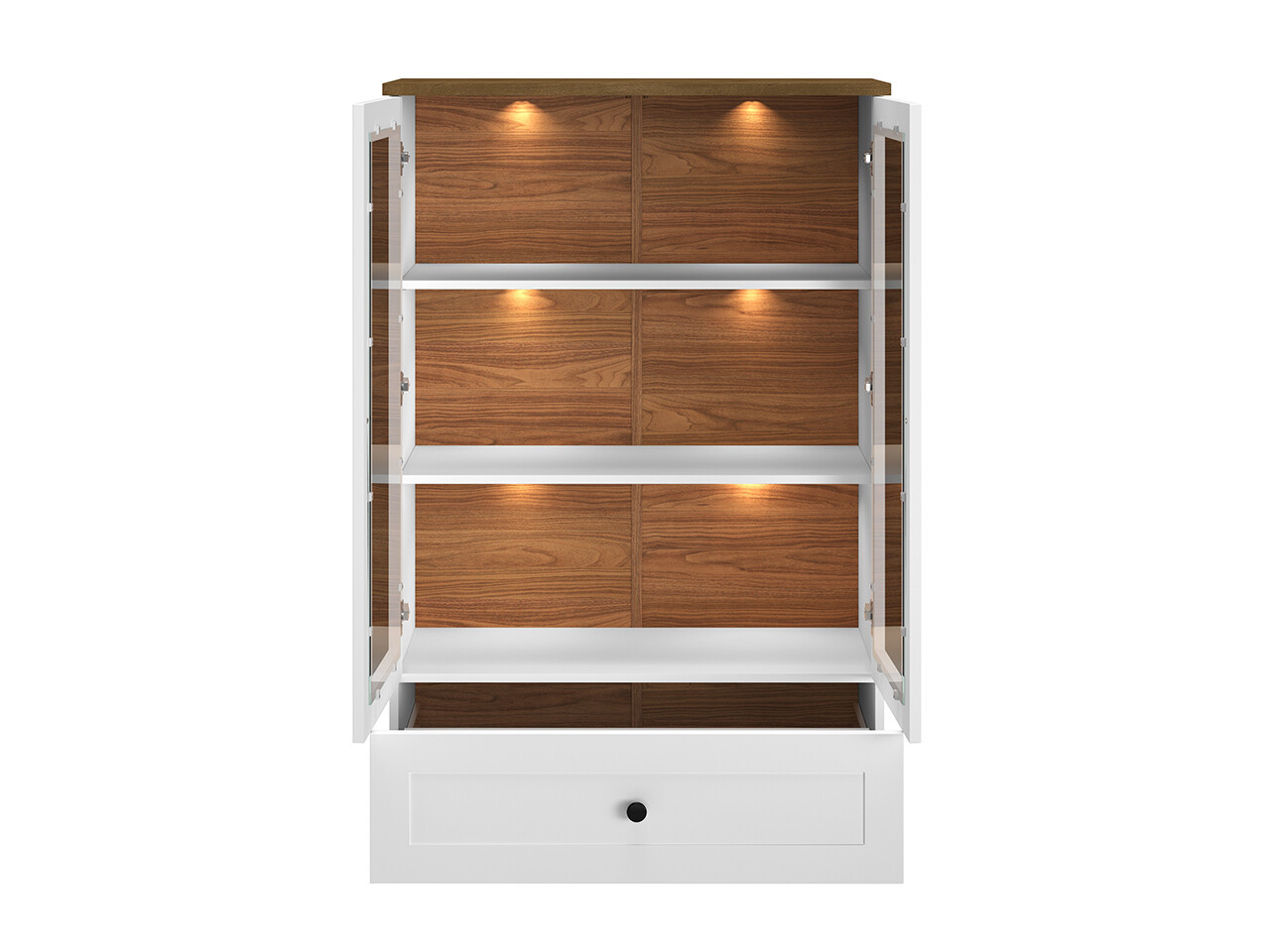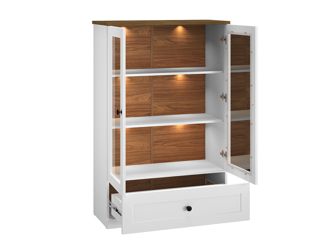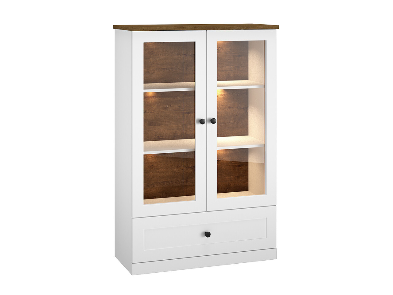 Vitrína Lille  je vyroben z kvalitního lamina v dezénu korpus bílá/bílý mat a vrchní deska dub lefkas. Plastová úchytka černé barvy. Předností kolekce je osvětlení, systém tichého dovírání a zásuvky se zvýšenou nosností. Zboží dodáváme v demontu.