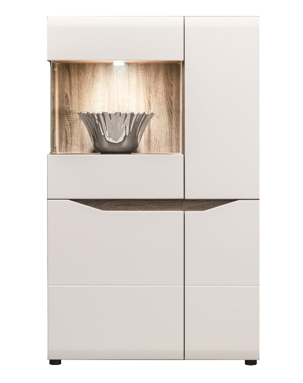 Vitrína zmá korpus vyroben z vysoce kvalitní laminované dřevotřískové desky v barvě dub sonoma lanýž. Dvířka a čela šuplíků jsou z MDF potažené PVC fólií v bílém lesku s frézovanými hranami. Tichý systém zavírání dveří a šuplíků ve standardu. K vitríně je možno doobjednat LED osvětlení za 476 Kč. Zboží je dodáváno v demontu.