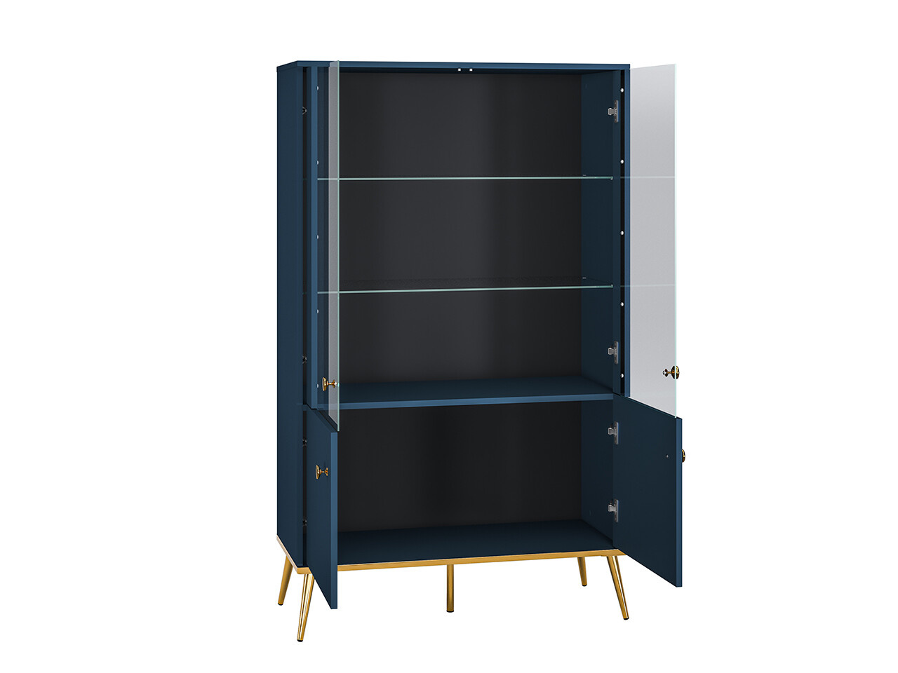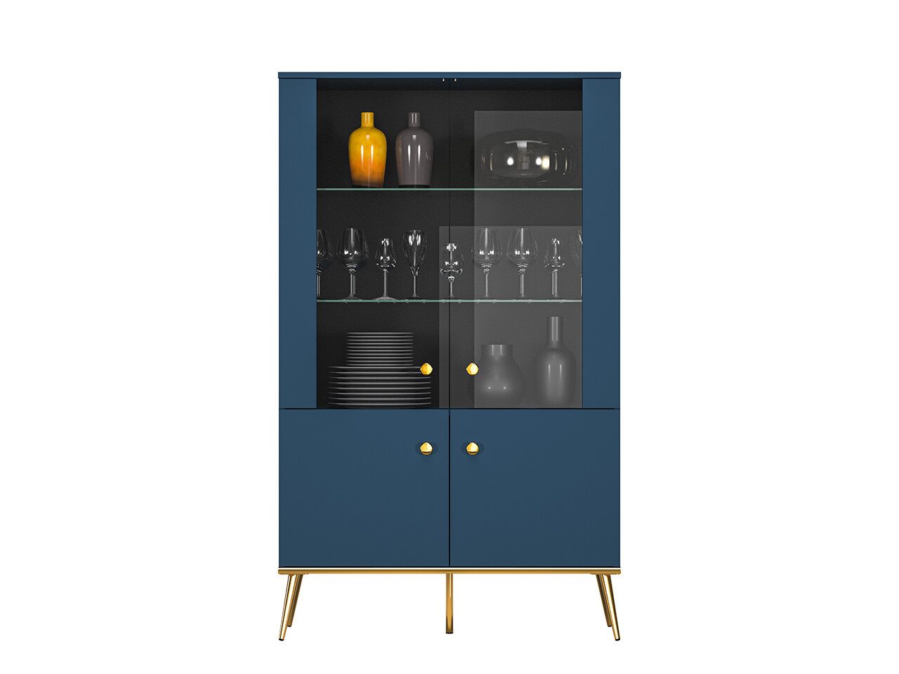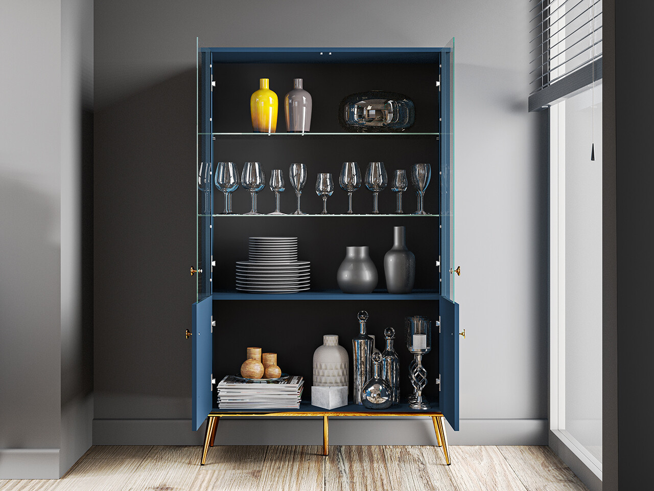 Vitrína Marine je vyrobena z vysoce kvalitní laminované dřevotřískové desky s ABS hranou v modré barvě. Stabilní vysoké nohy v kovovém provedení a dvojitě pozinkovaná rukojeť jsou ve zlatém provedení. Zboží dodáváme v demontu.