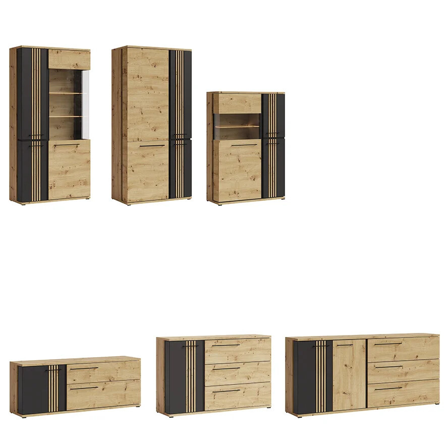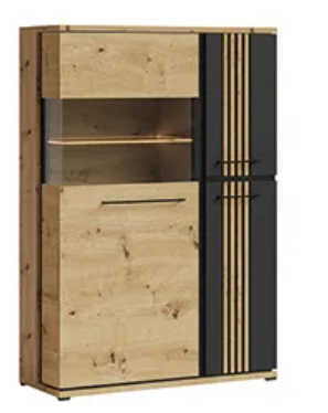 Moderní vitrína Molto je vyrobena z kvalitního a odolného lamina, v kombinaci dezénu dub artisan/černá mat. Tato vitrína má mnoho úložného prostoru. Úchytky v černé barvě. Zboží dodáváme v demontu.