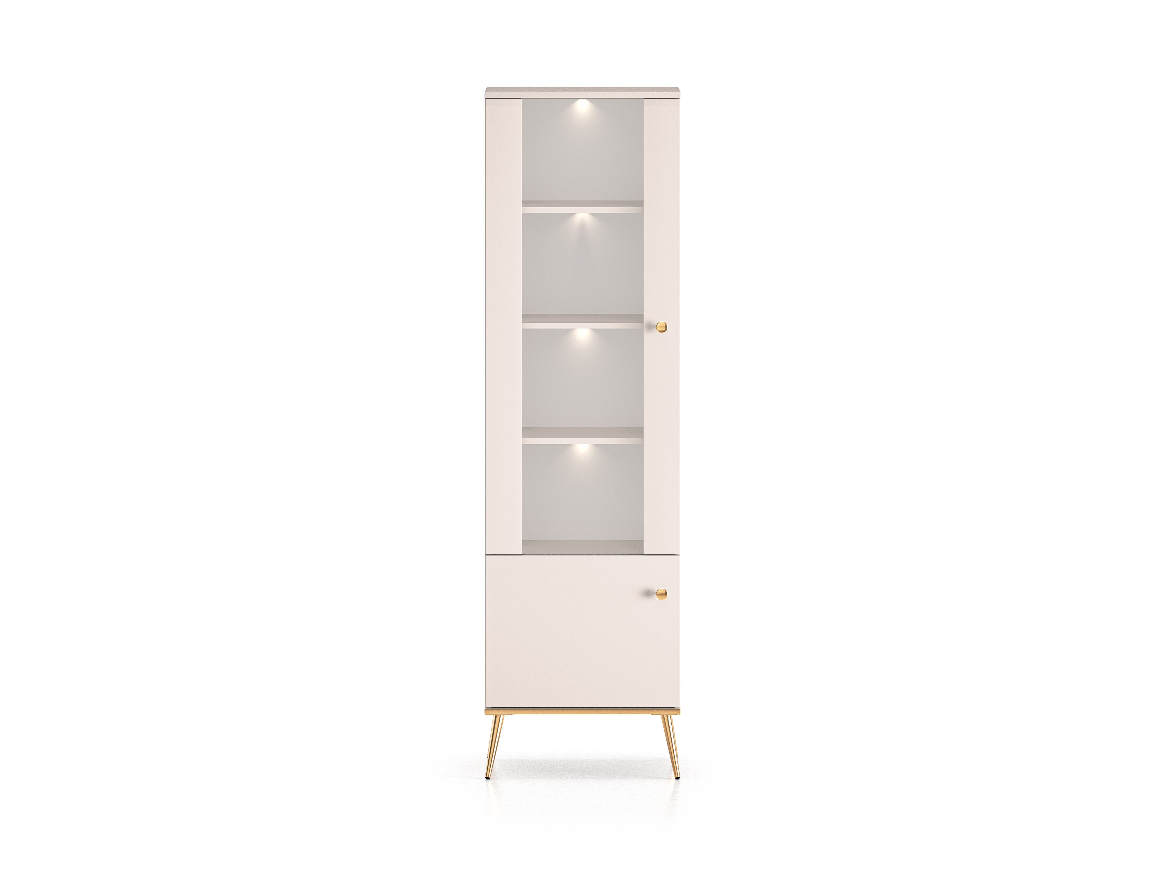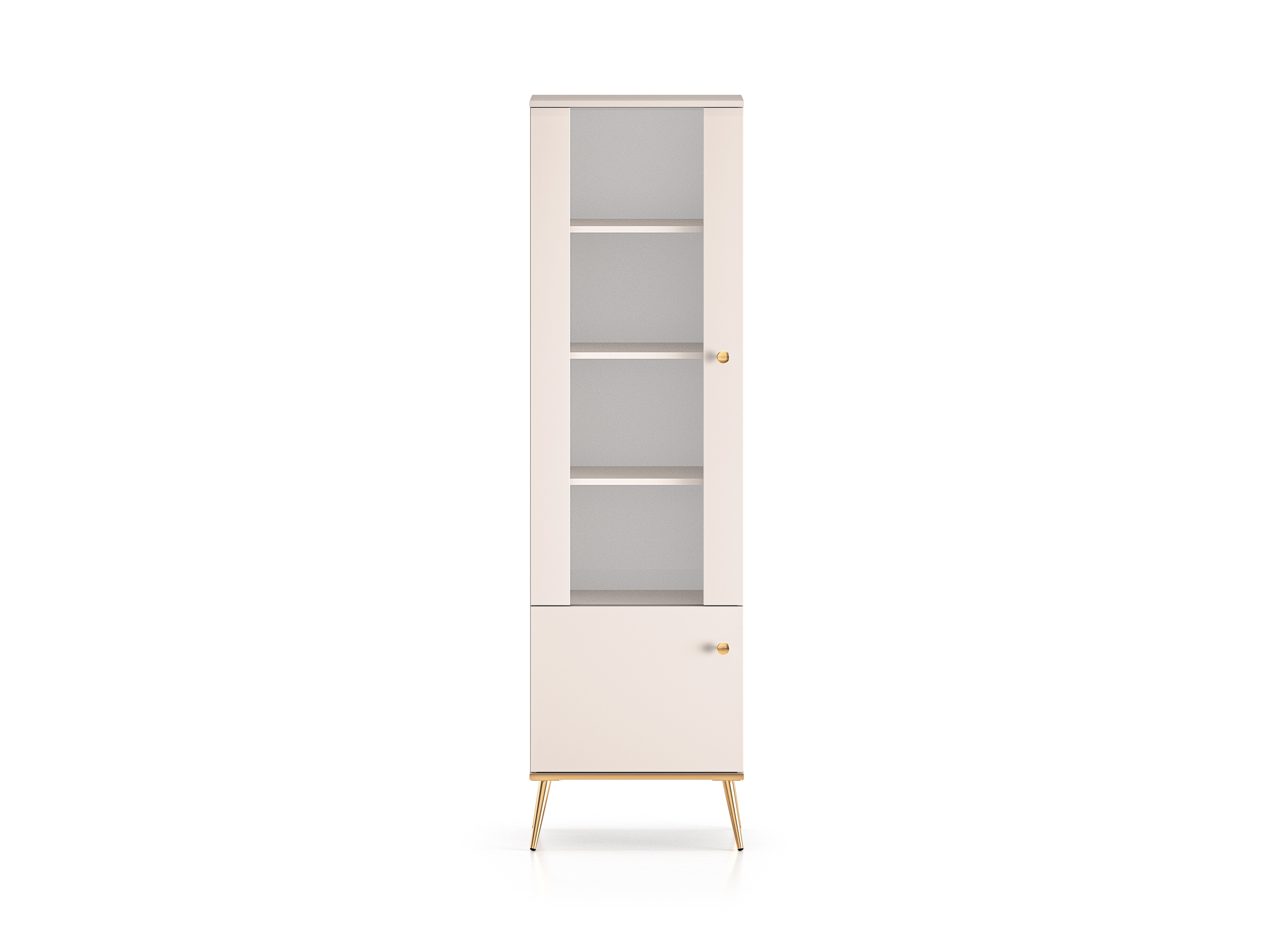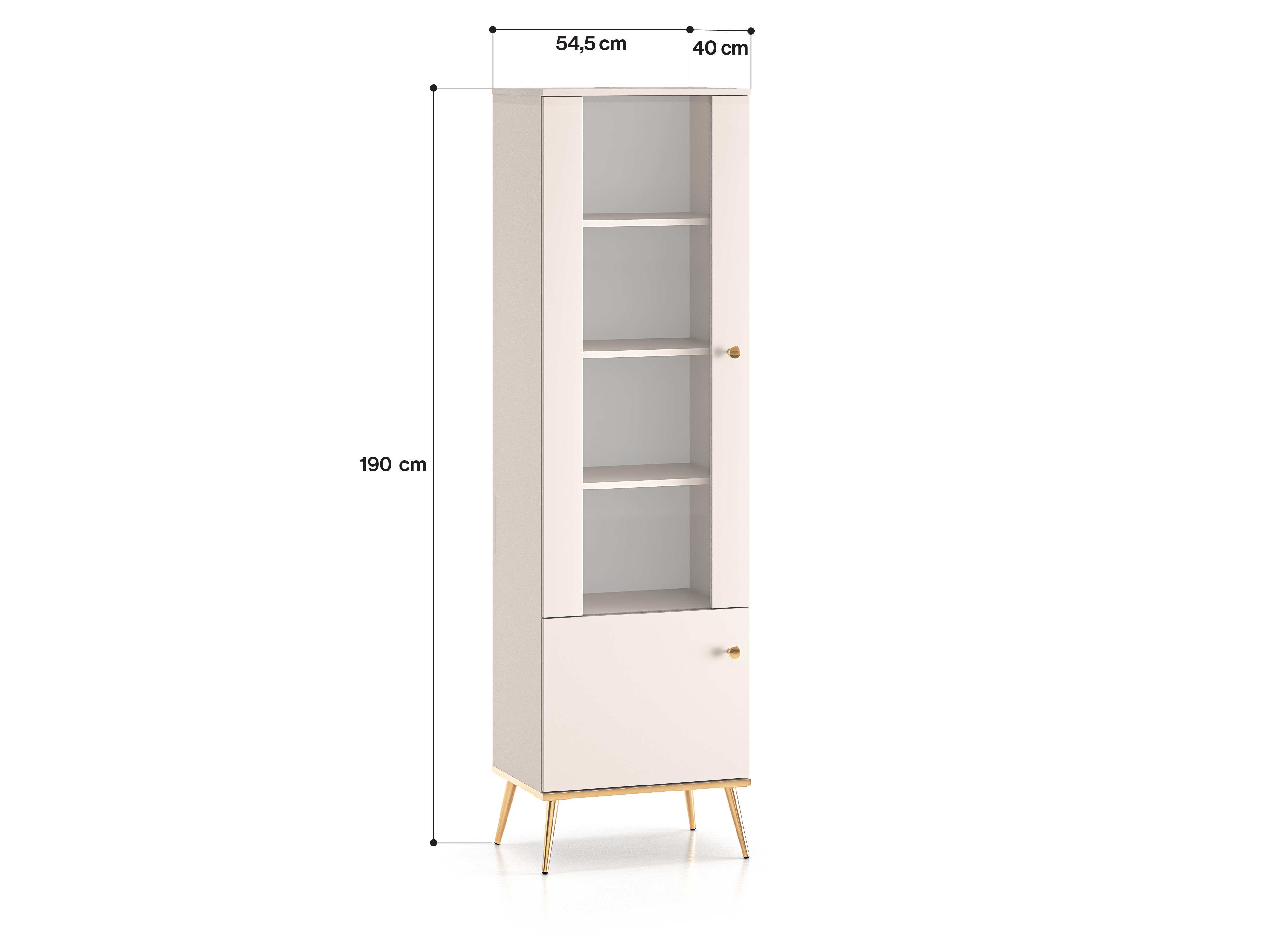 Vitrína je vyrobená z kvalitního lamina v bílém provedení. Stabilní vysoké nohy v kovovém provedení a dvojitě pozinkovaná rukojeť jsou ve zlatém provedení. Zboží dodáváme v demontu.