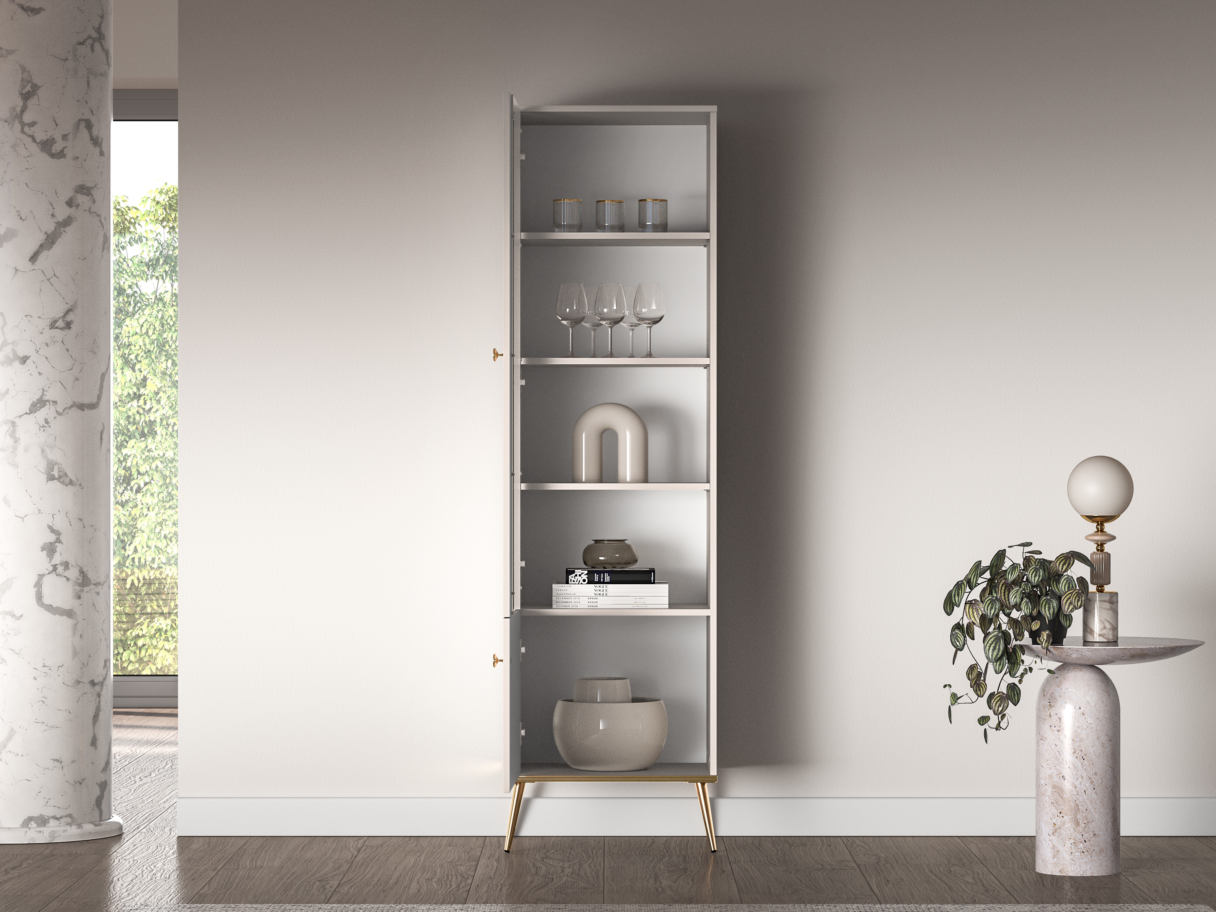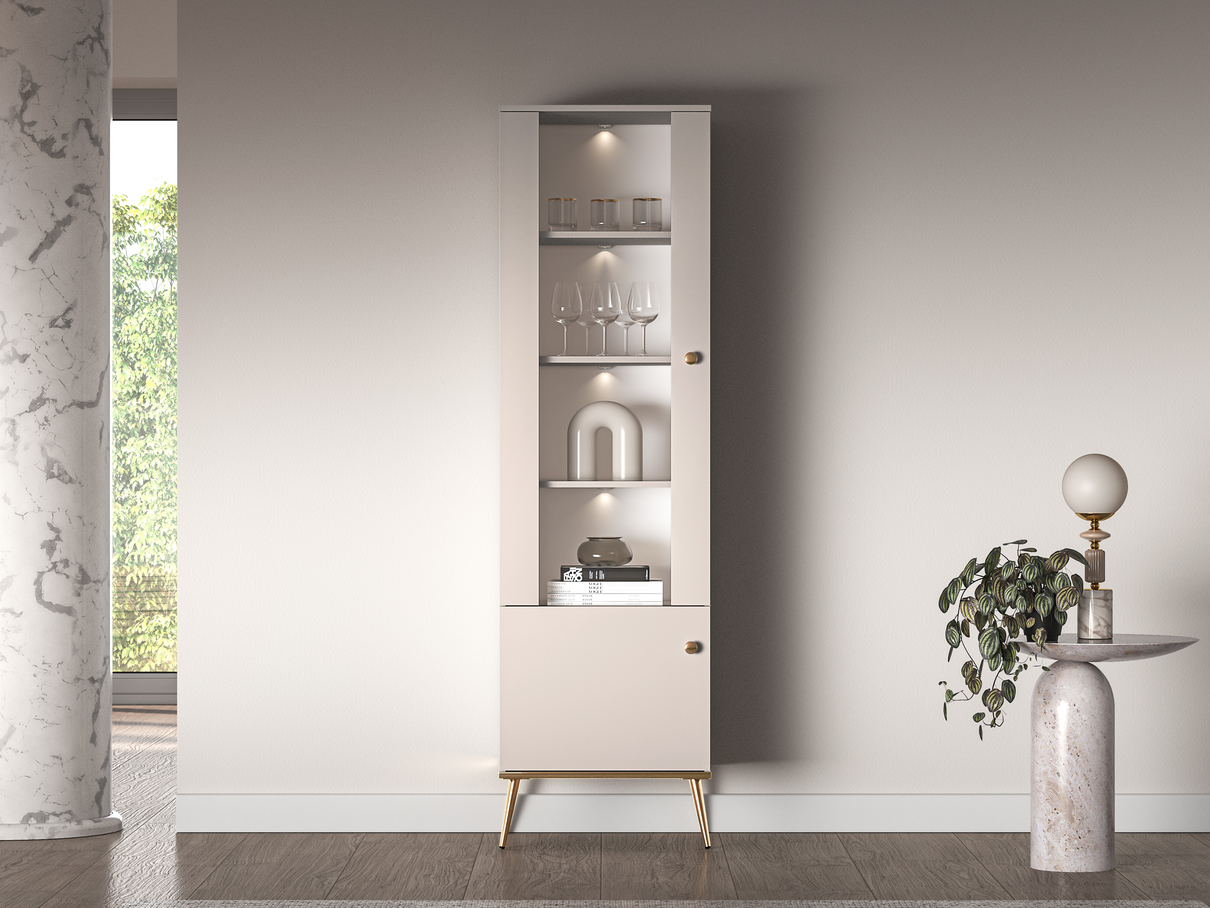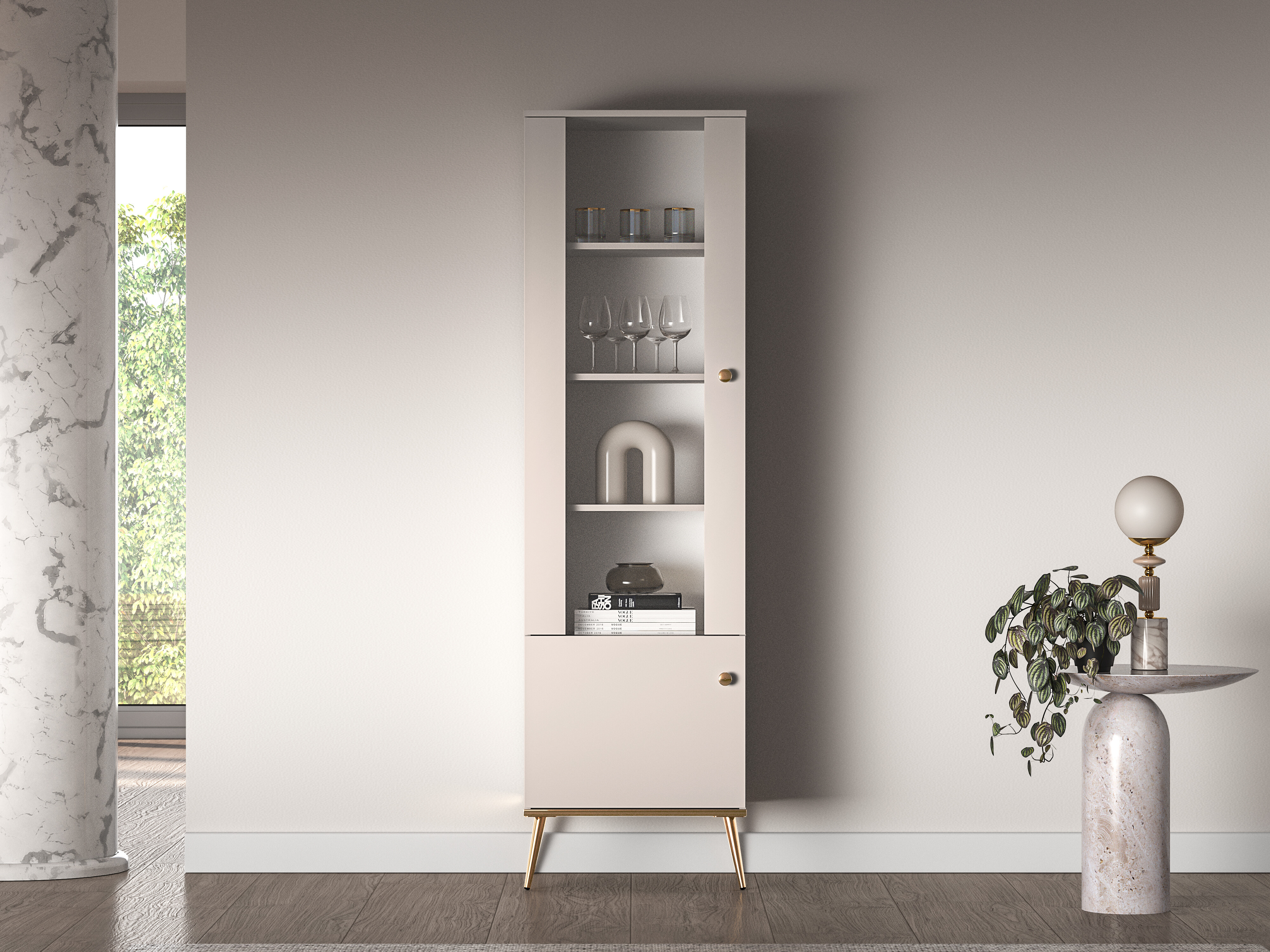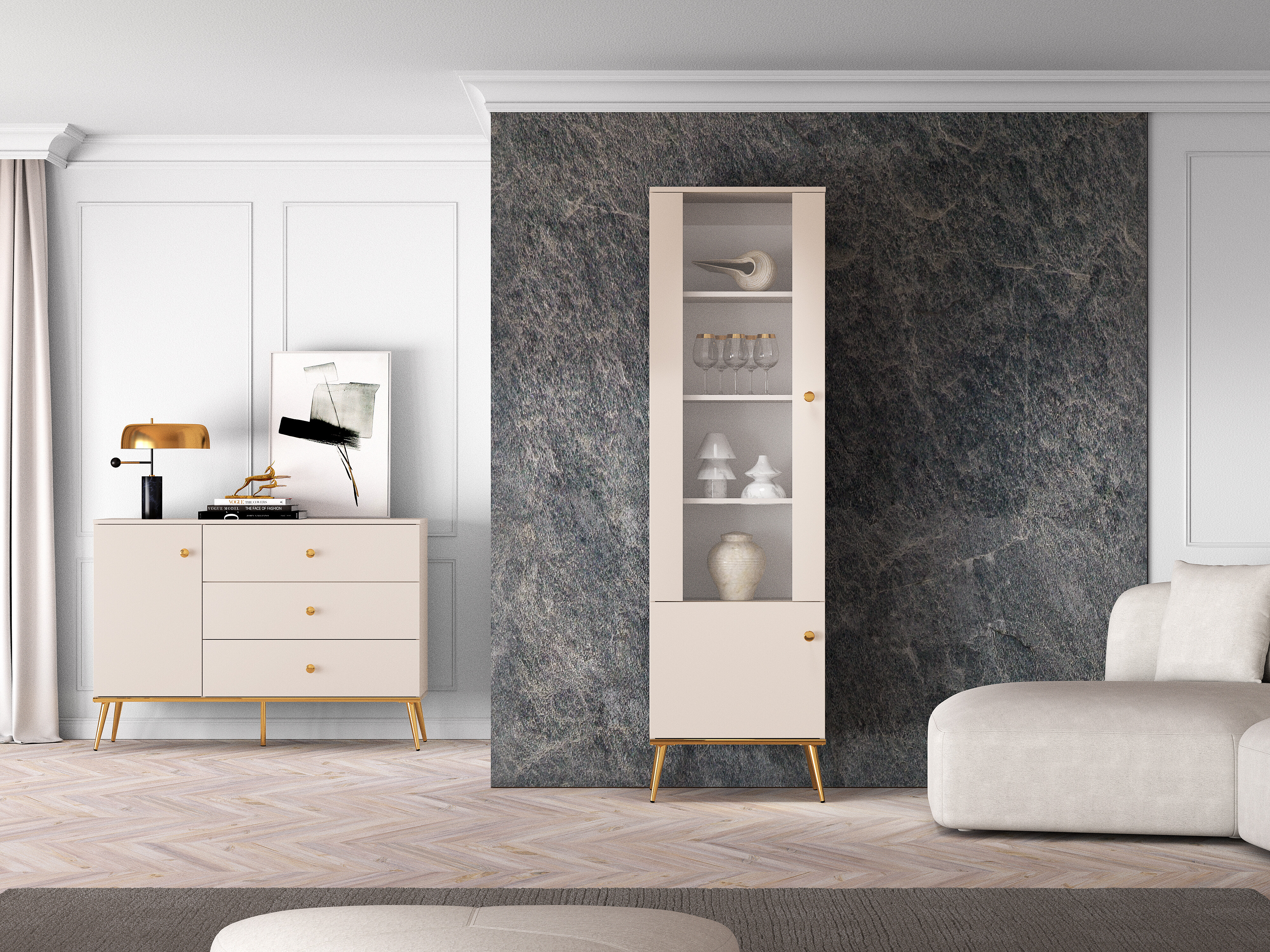 Vitrína je vyrobená z kvalitního lamina v bílém provedení. Stabilní vysoké nohy v kovovém provedení a dvojitě pozinkovaná rukojeť jsou ve zlatém provedení. Zboží dodáváme v demontu.