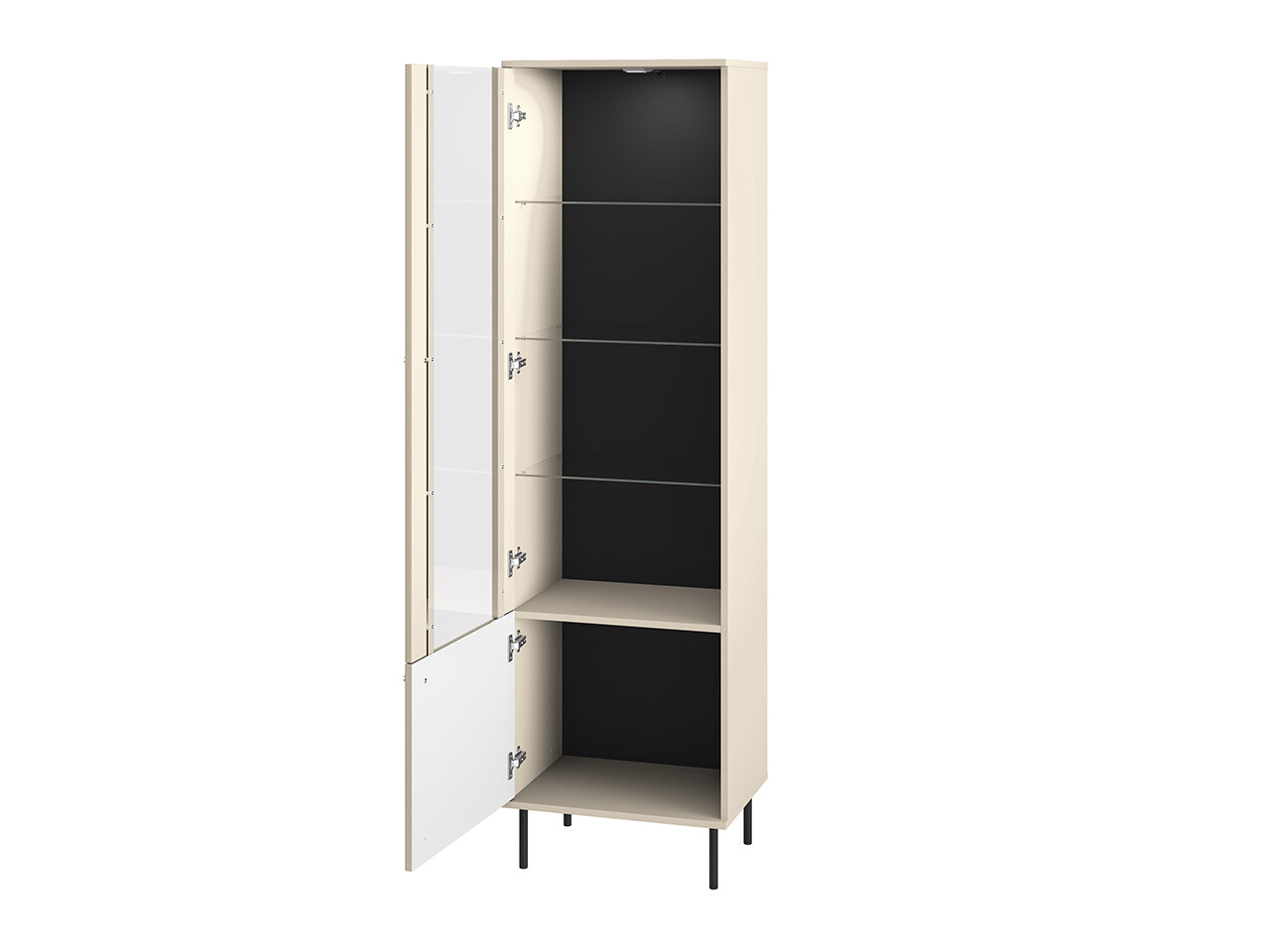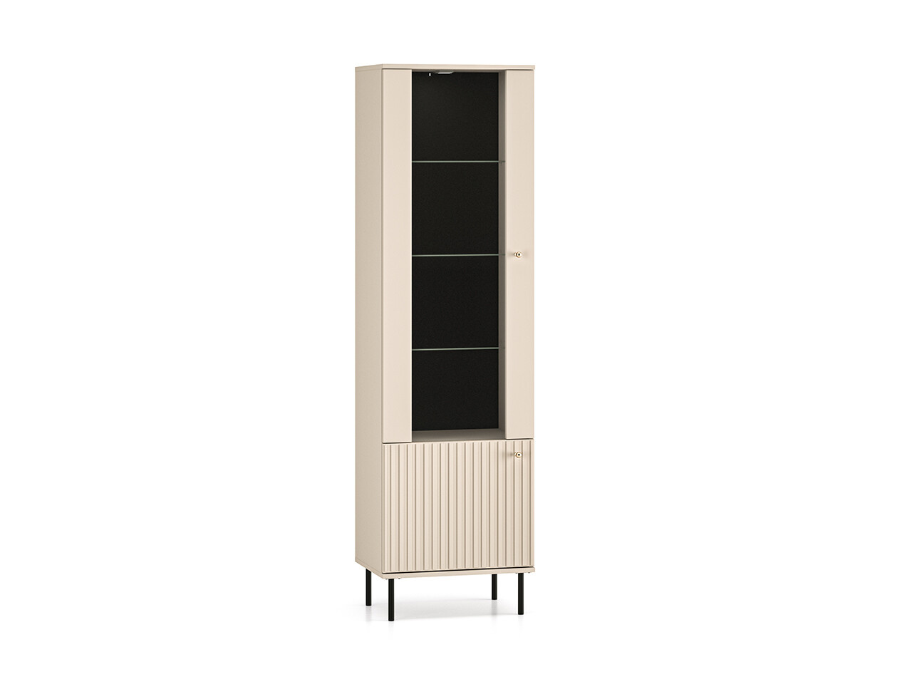 Vitrína SOPHIE je vyrobena z vysoce kvalitní laminované dřevotřískové desky s ABS hranou v kašmírové barvě. Vyznačuje se stylovými černými kovovými nohami a drážkovanými předními čílky se zlatými úchytkami. Kuličkové vodítka a panty s tichým zavíráním zajišťují komfort používání. Zboží dodáváme v demontu.