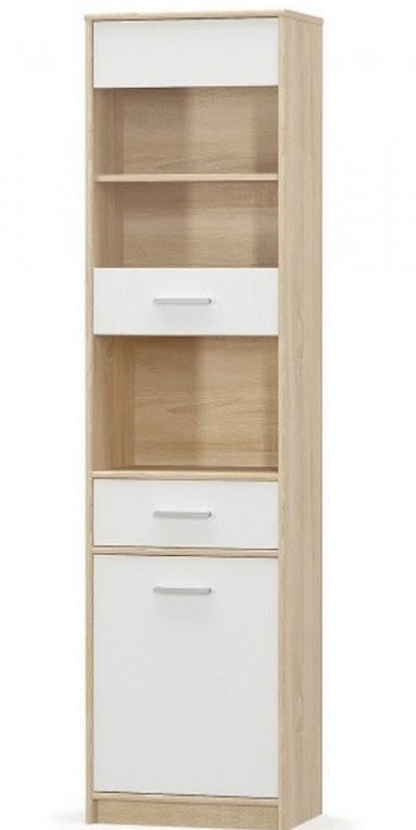 Vysoká vitrína z lamina o síle 16mm z kolekce Tips. Vitrínu se zásuvkou, částečně prosklenými a plnými dvířky se 3 policemi nabízíme v dezénu bílá/ dub sonoma. Hrany lamina chrání ABS o síle 0,5mm. Pojezdy zásuvky jsou kovové, úchytky plastové. Nábytek TIPS je určen do předsíně, obývacího nebo studentského pokoje. Zboží dodáváme v demontu.