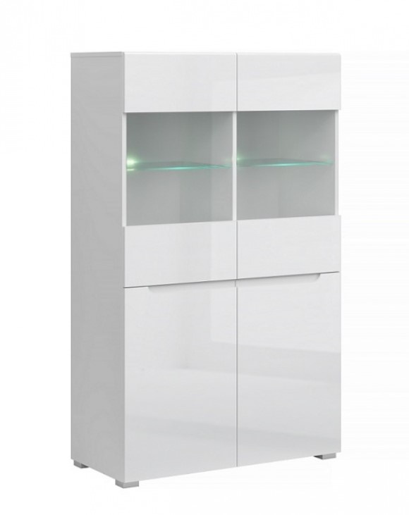 Moderní policová vitrína je vyrobena z LDTD, jsou použity ABS hrany. Čela a dvířka jsou z MDF, olepená folií. Vitrína je opatřena plastovými nožkami a má bezúchytová dvířka. K vitríně lze dokoupit led osvětlení. Zboží dodáváme v demontu.