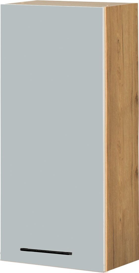 Horní skříňka je vyrobena z lamina v provedení korpus dub soma tmavý o tl. 16mm, dvířka MDF šedá. Ve skříňce je použito kování s tichým dojezdem. Možnost otvírání dvířek pravé/ levé. Skříňky obsahují kompletní kování, úchytky a návod k sestavení. Zboží dodáváme v demontu.