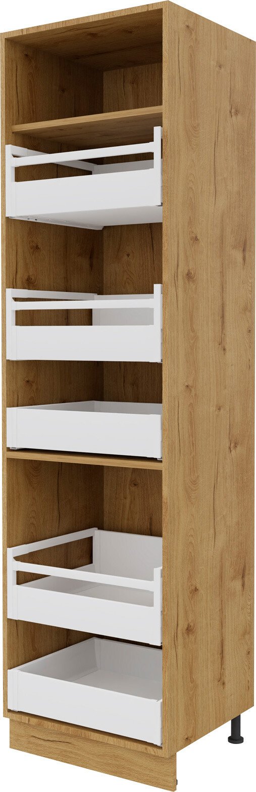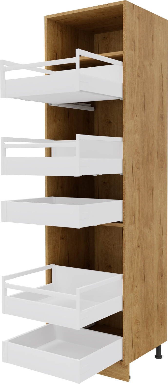 Potravinová skříň se šuplíky wewnatrz je vyrobena z lamina v provedení korpus dub soma tmavý o tl. 16mm, dvířka MDF šedé. Ve skříňce je použito kování s tichým dojezdem. Nožky jsou v barvě chromu. Skříňky obsahují kompletní kování, úchytky a návod k sestavení. Cena je bez soklu - nutno objednat zvlášť. Zboží dodáváme v demontu.
