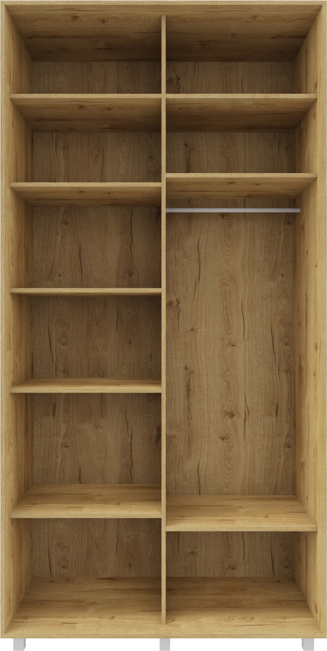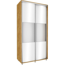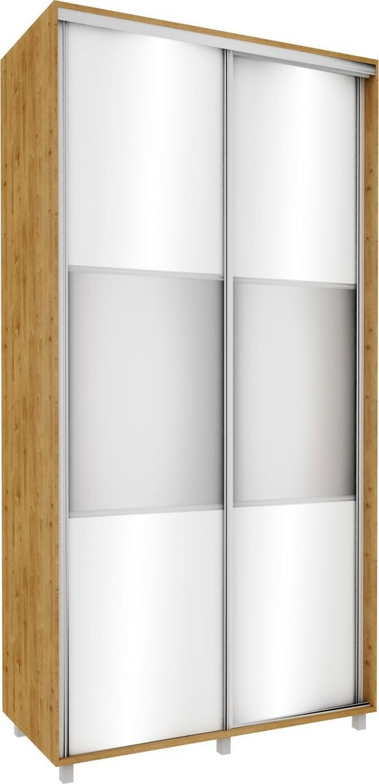 Vysoká šatní skříň z kvalitního lamina v korpusu dub soma tmavý, posuvnými dveřmi v bílém lesku se zrcadlem. Skříně jsou vyrobeny z precizně vyrobených a odolných prvků. Zboží je dodáváno v demontu.