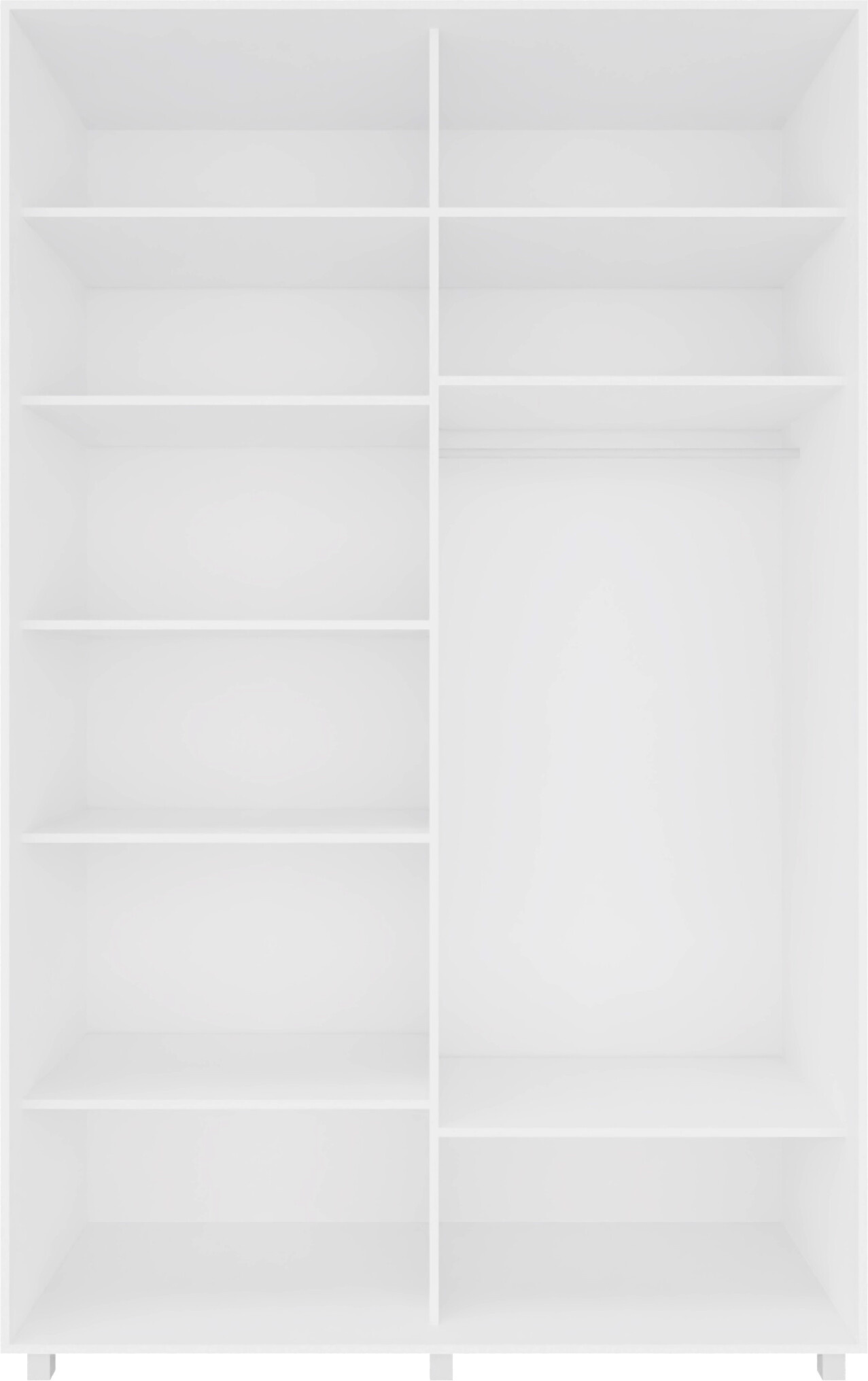 Vysoká šatní skříň z kvalitního lamina v barvě bílý mat je vybavena zrcadly na dvou posuvných dveřích. Skříně jsou vyrobeny z precizně vyrobených a odolných prvků. Zboží je dodáváno v demontu.