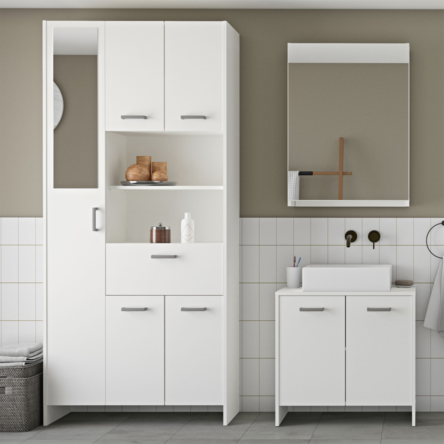barevné provedení bílá jedna zásuvka s kovovými pojezdy v pravé části se nachází dvě skříňky, každá s jednou policí v levé části vysoká skříňka se zrcadlem a čtyřmi policemi součást sestavy KORAL