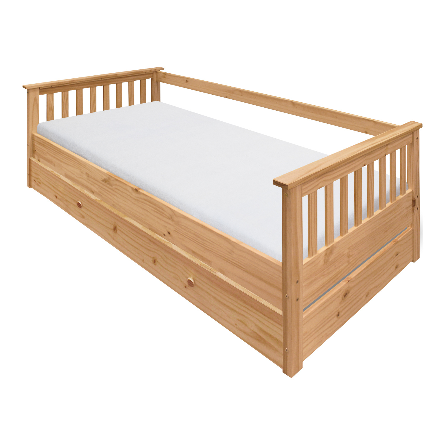 materiál masiv borovice voskovaná v medovém odstínu výsuvná na kolečkách, cena bez matrace maximální doporučená výška matrace 14 cm doporučený rozměr matrace 90 × 200 cm vhodná jako výsuvná přistýlka k pohovce TORINO 8085V