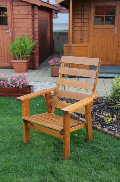 Masivní zahradní křeslo české výroby je vyrobeno z masivního dřeva borovice, síla materiálu 28 mm. Toto zahradní křeslo má vysoce kvalitní opracování a je stabilní, pevné provedení. Zahradní křeslo je bez povrchové úpravy. Křeslo je dodávána v demontu včetně spojovacího materiálu, plánku na montáž,návodu na údržbu a povrchovou úpravu.
