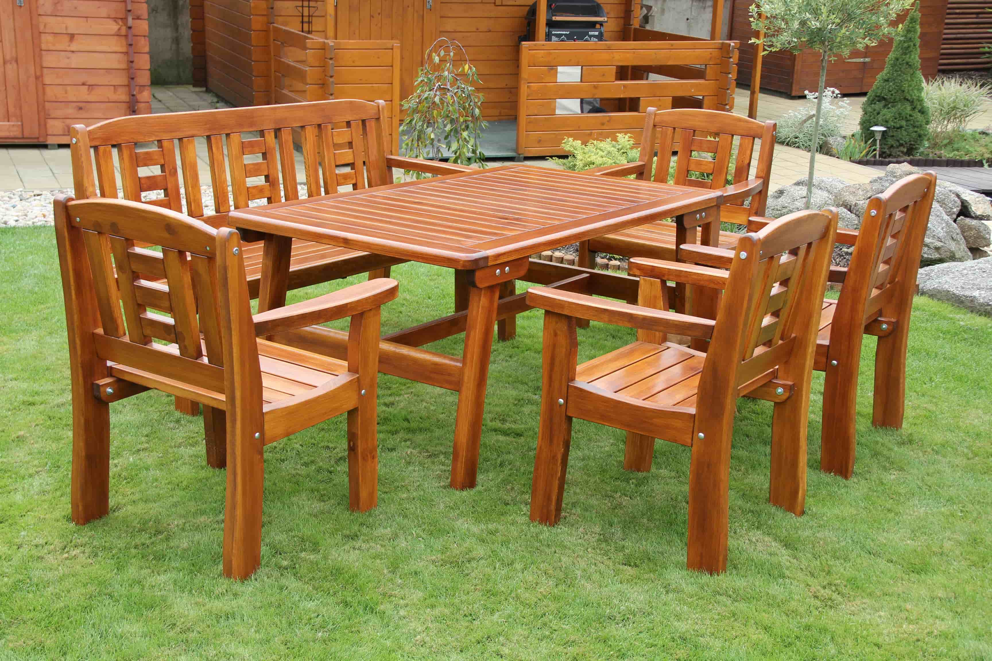 Masivní zahradní sestava české výroby je vyrobena z masivního dřeva borovice, síla materiálu 42, 28 mm. Tato zahradní sestava má vysoce kvalitní opracování a je stabilní, pevné provedení. Sestava Gold velká je dodávána v demontu včetně spojovacího materiálu, plánku na montáž,návodu na údržbu a povrchovou úpravu.