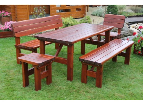 Zahradní sestava Rovná II obsahuje: 1x zahradní stůl + 1x zahradní lavice s opěradlem + 1x zahradní lavice bez opěradla + 1x židle +1x stolička, tuto sestavu lze zakoupit i na jednotlivé segmenty.