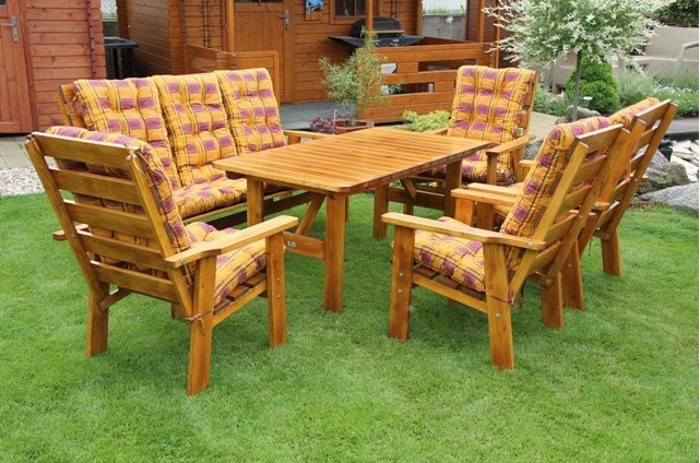 Masivní zahradní sestava české výroby je vyroben z masivního dřeva borovice, síla materiálu 28 mm. Táto zahradní sestava má vysoce kvalitní opracování a je stabilní, pevné provedení. Zahradní sestava je bez povrchové úpravy. Polstr je nahoře i dole opatřen tkaničkami, které usnadní uchycení. Sestava je dodávána v demontu včetně spojovacího materiálu, plánku na montáž, návodu na údržbu a povrchovou úpravu.