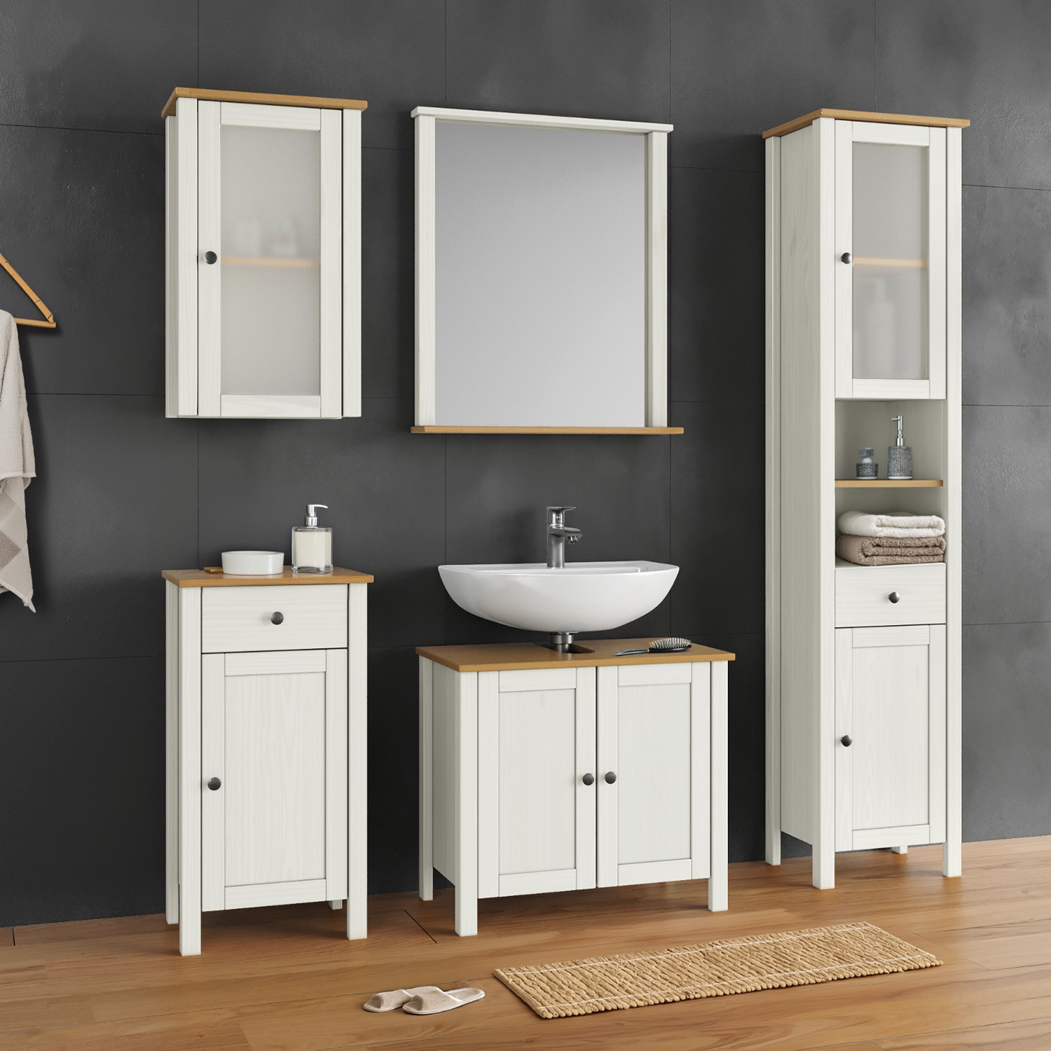 Skříňka PORTO je vyrobena z masivu borovice v provedení bílá/ buk lak. Dvířka jsou prosklená. Skříňka je součástí sestavy PORTO bílá/ buk. Zboží dodáváme v demontu.