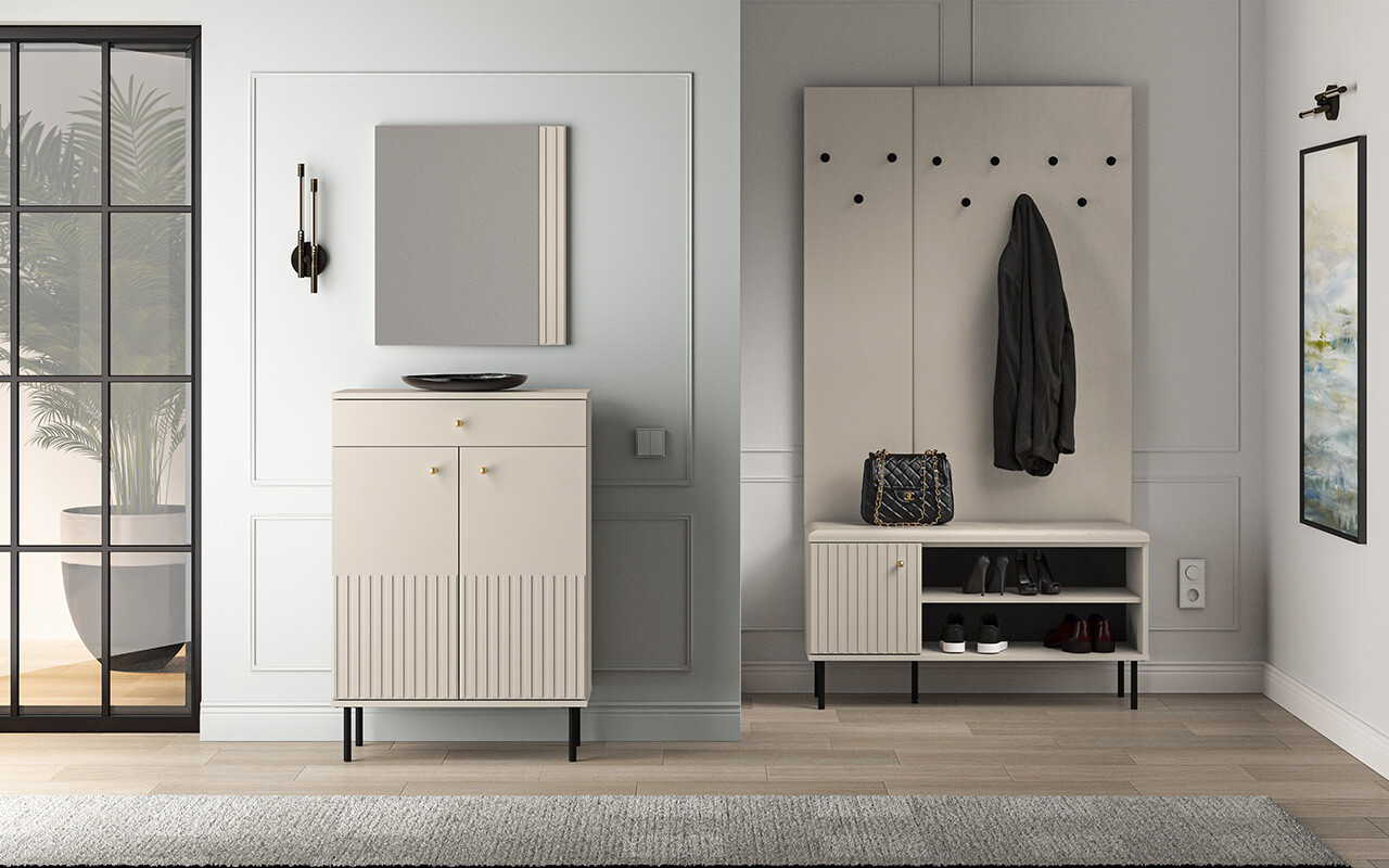Zrcadlo SOPHIE je vyrobena z vysoce kvalitní laminované dřevotřískové desky s ABS hranou v kašmírové barvě. Vyznačuje se stylovými černými kovovými nohami a drážkovanými předními čílky se zlatými úchytkami. Kuličkové vodítka a panty s tichým zavíráním zajišťují komfort používání. Zboží dodáváme v demontu.